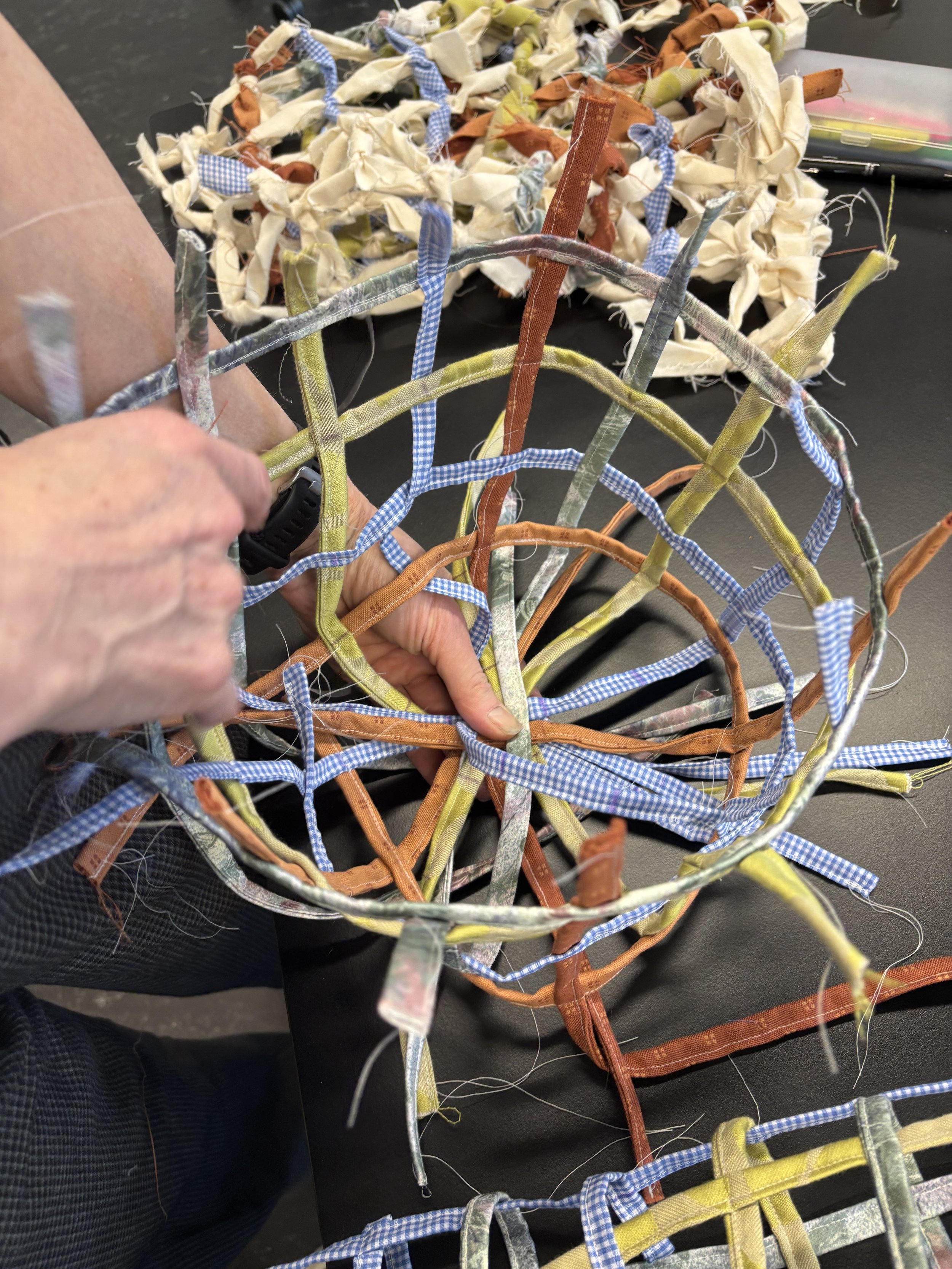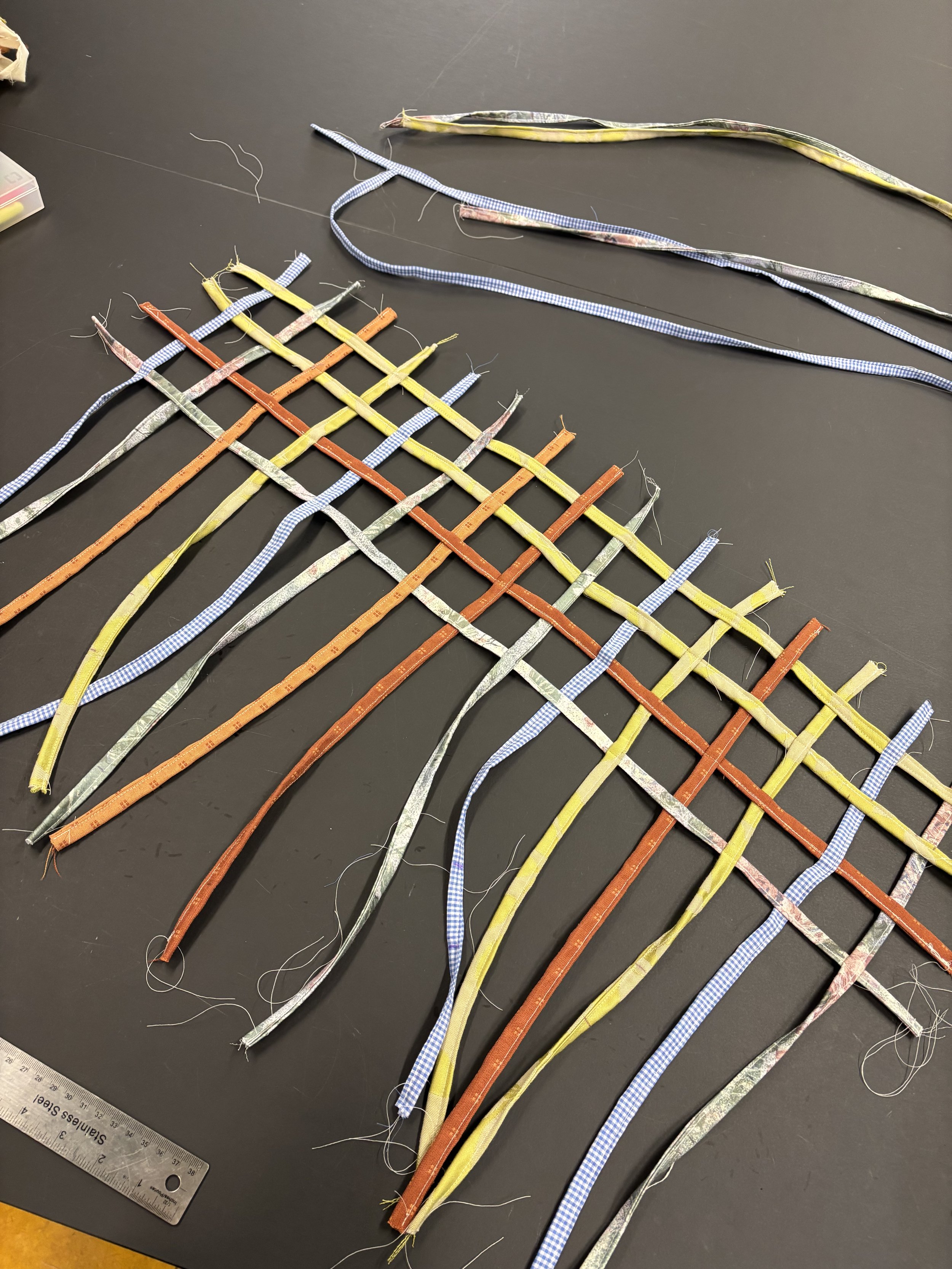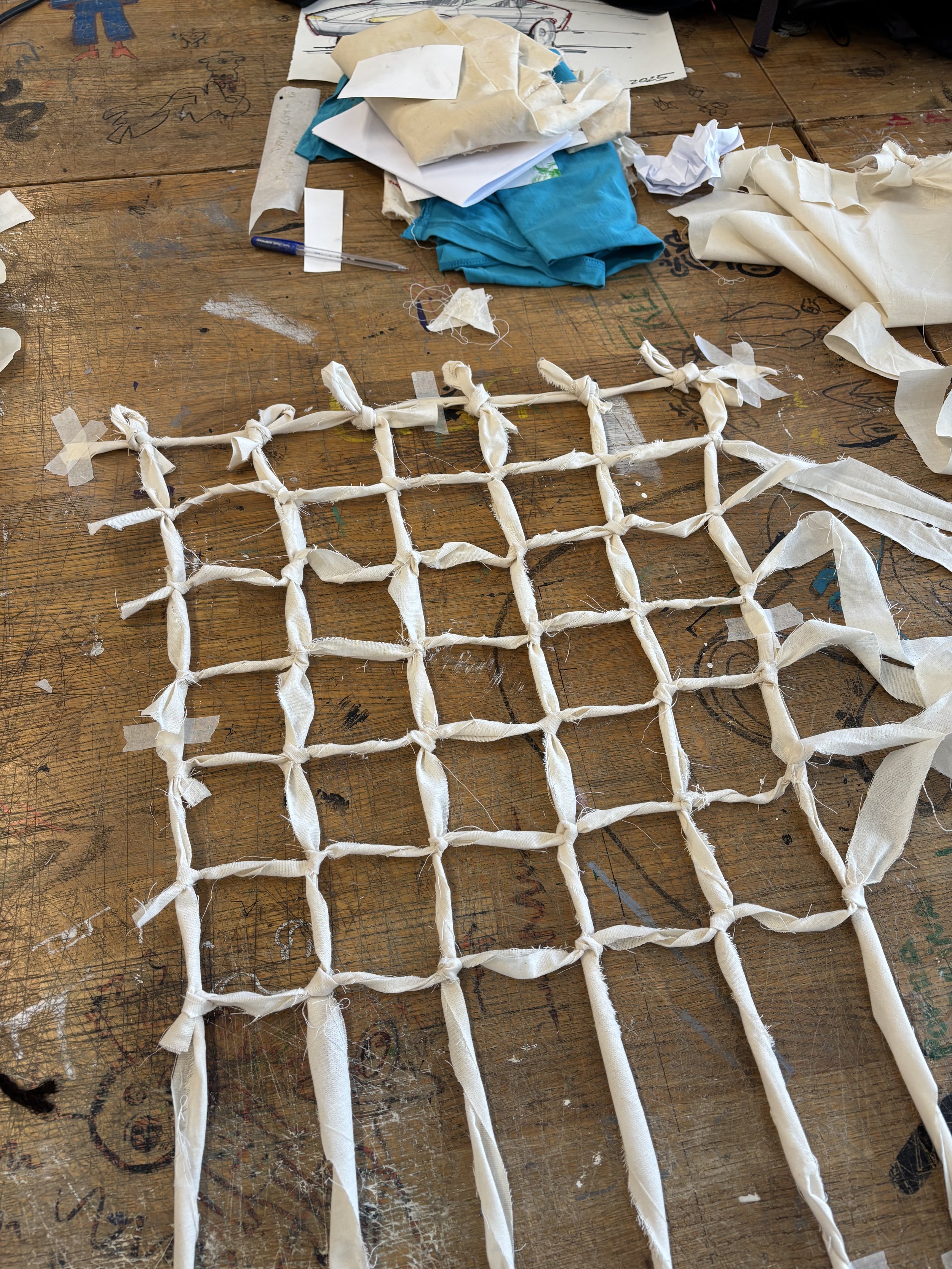 Through prototyping I discovered that sewing the fabric into long individual strips held the strongest or stiffest form, so I began production by sewing many of these long strips to make a grid.