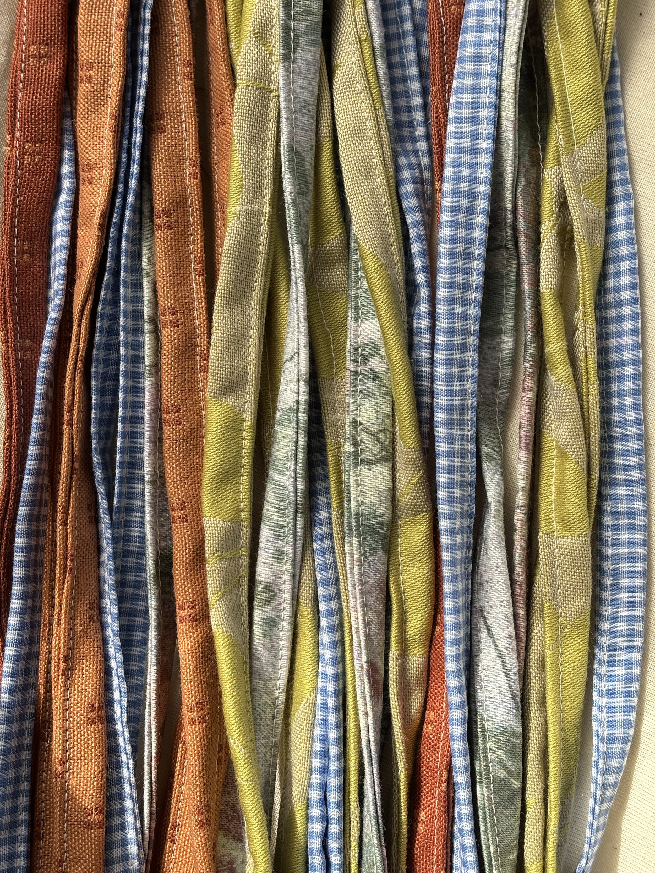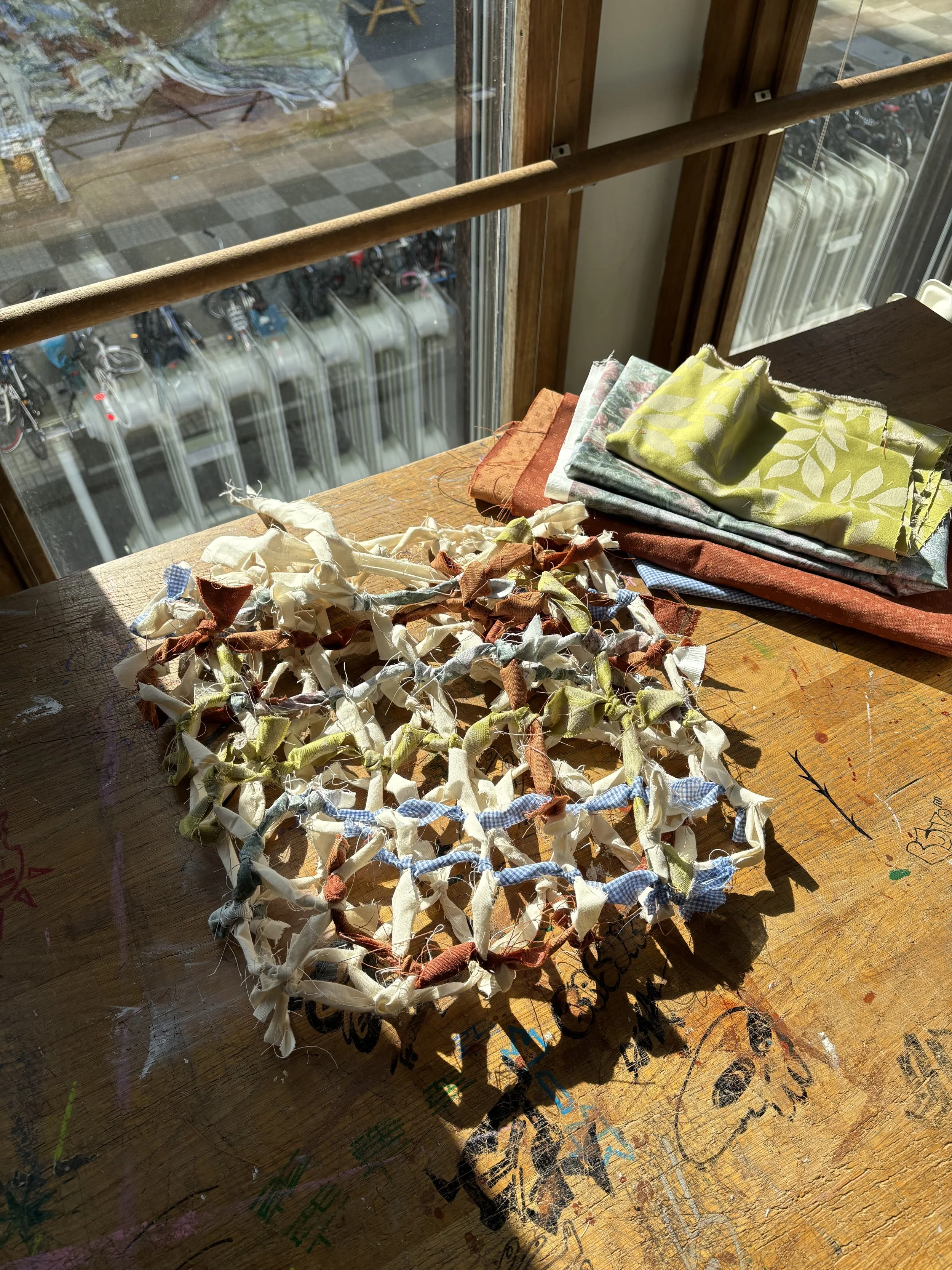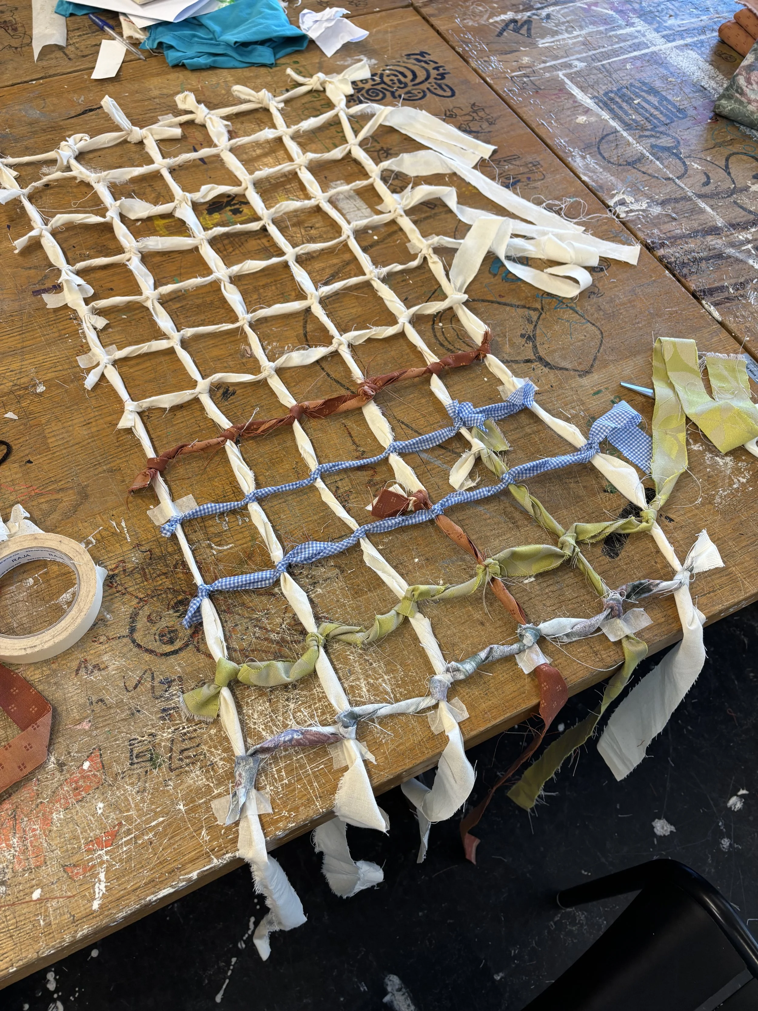 Through prototyping I discovered that sewing the fabric into long individual strips held the strongest or stiffest form, so I began production by sewing many of these long strips to make a grid.