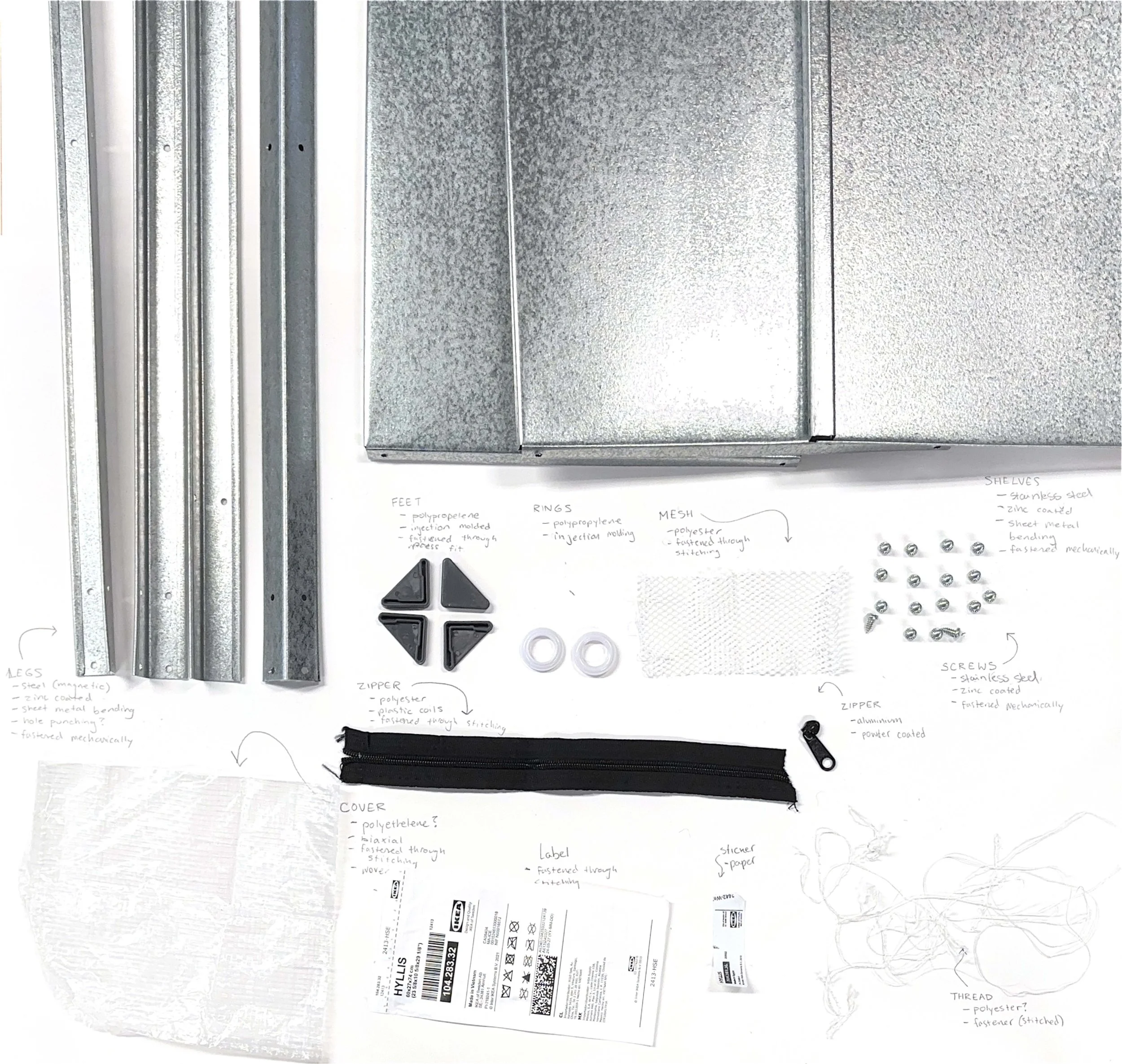I began this project by taking the original product apart to assess all of the parts it’s made of. The JÄLL is composed of over 10 different materials. Why so complicated?