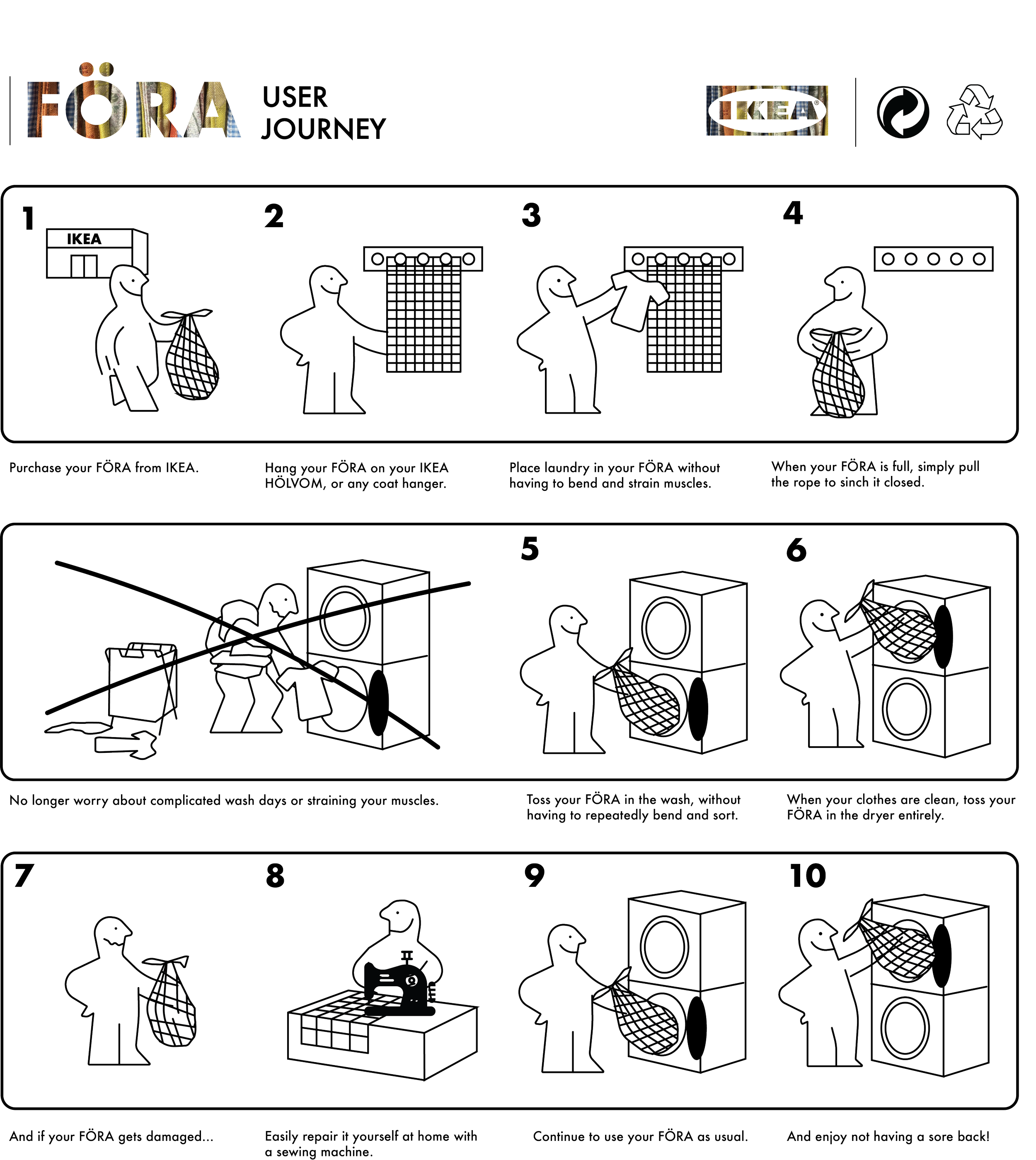 A socio and ecological redesign of Ikea’s Jäll laundry hamper. Made 100% out of recycled fabric, FÖRA hangs from your wall, and can be thrown right into the wash with your clothes, helping those with mobility issues in the home. Made out of one material for ease of recycling, repair, and material sourcing.