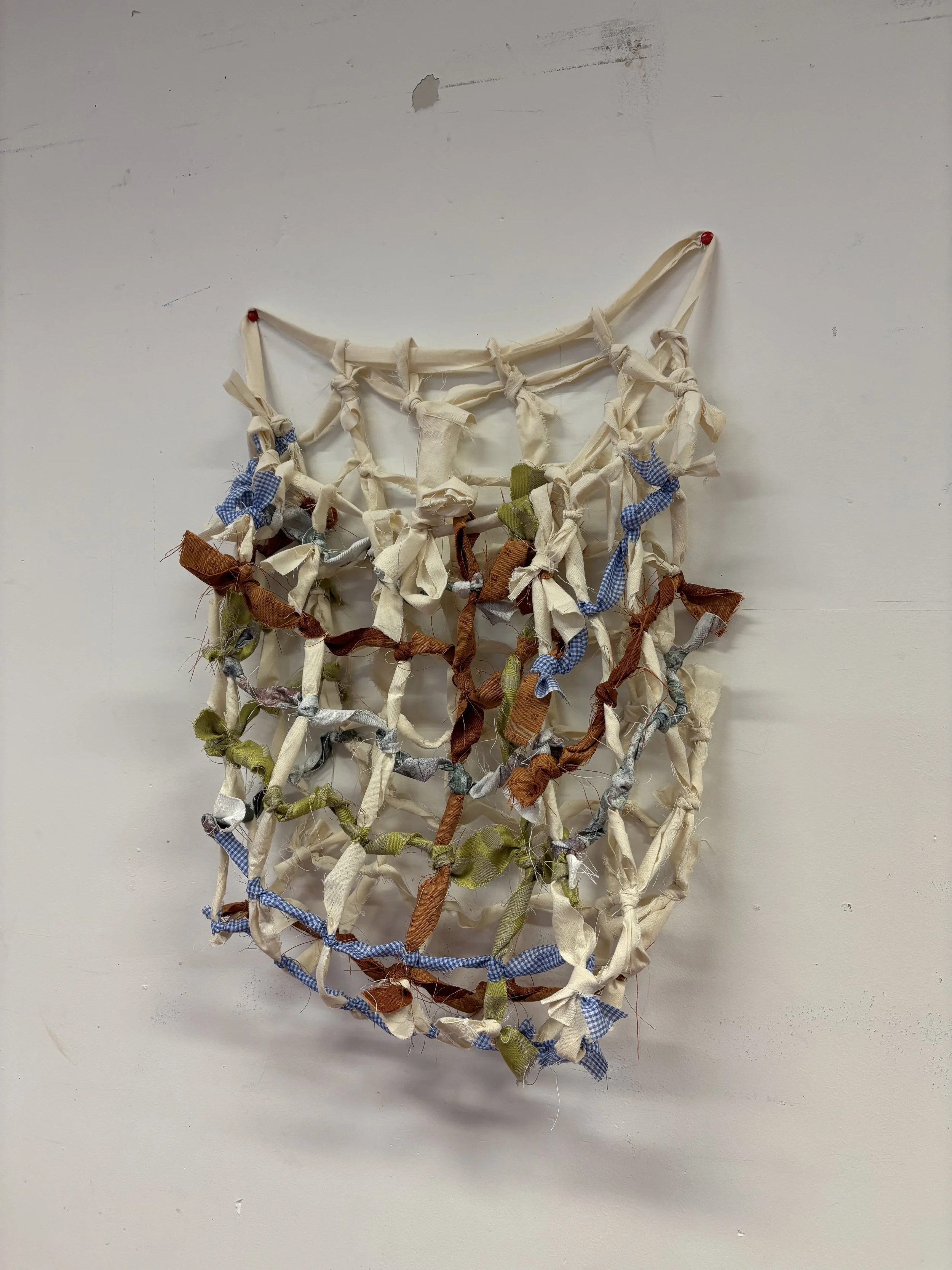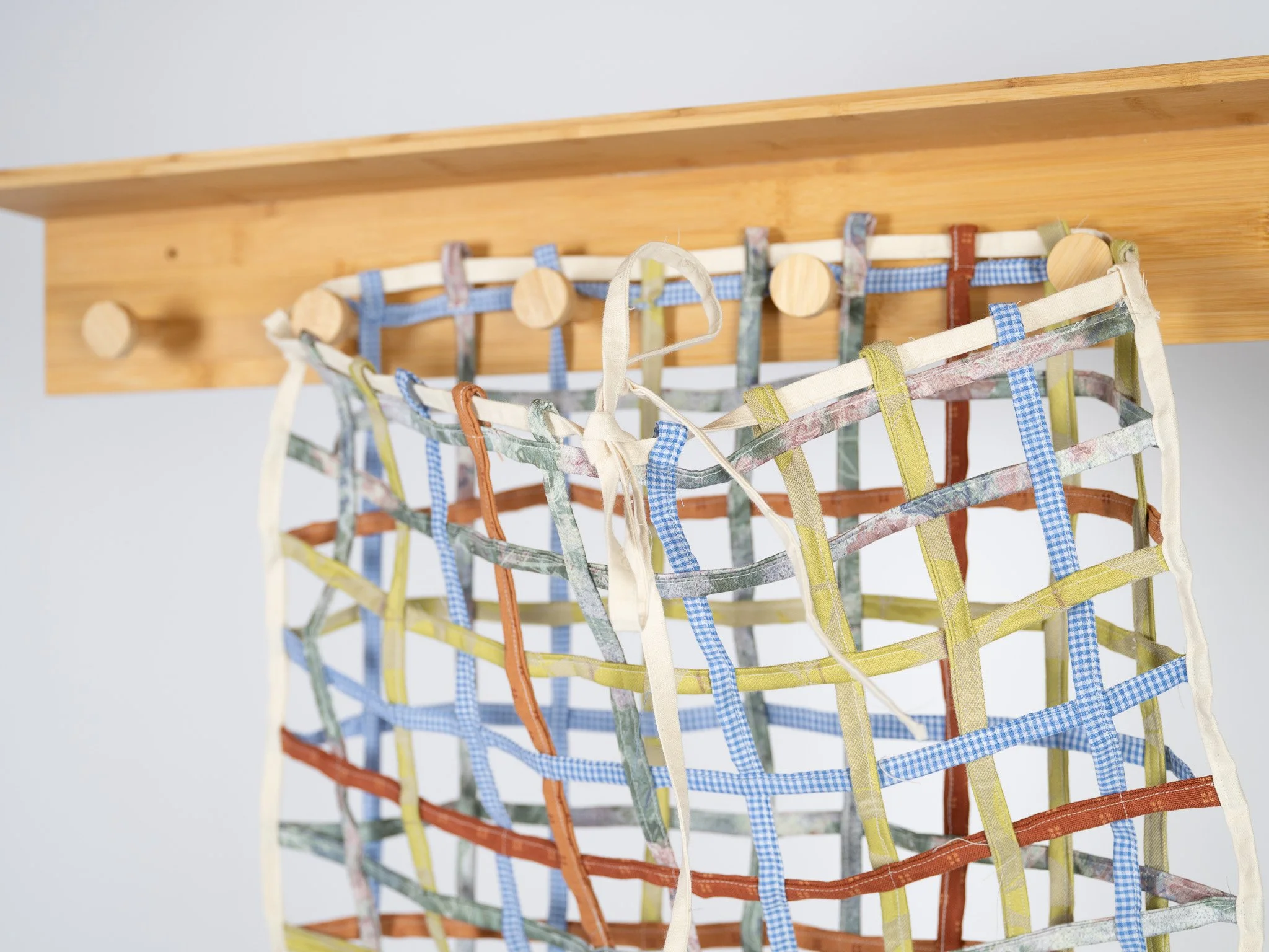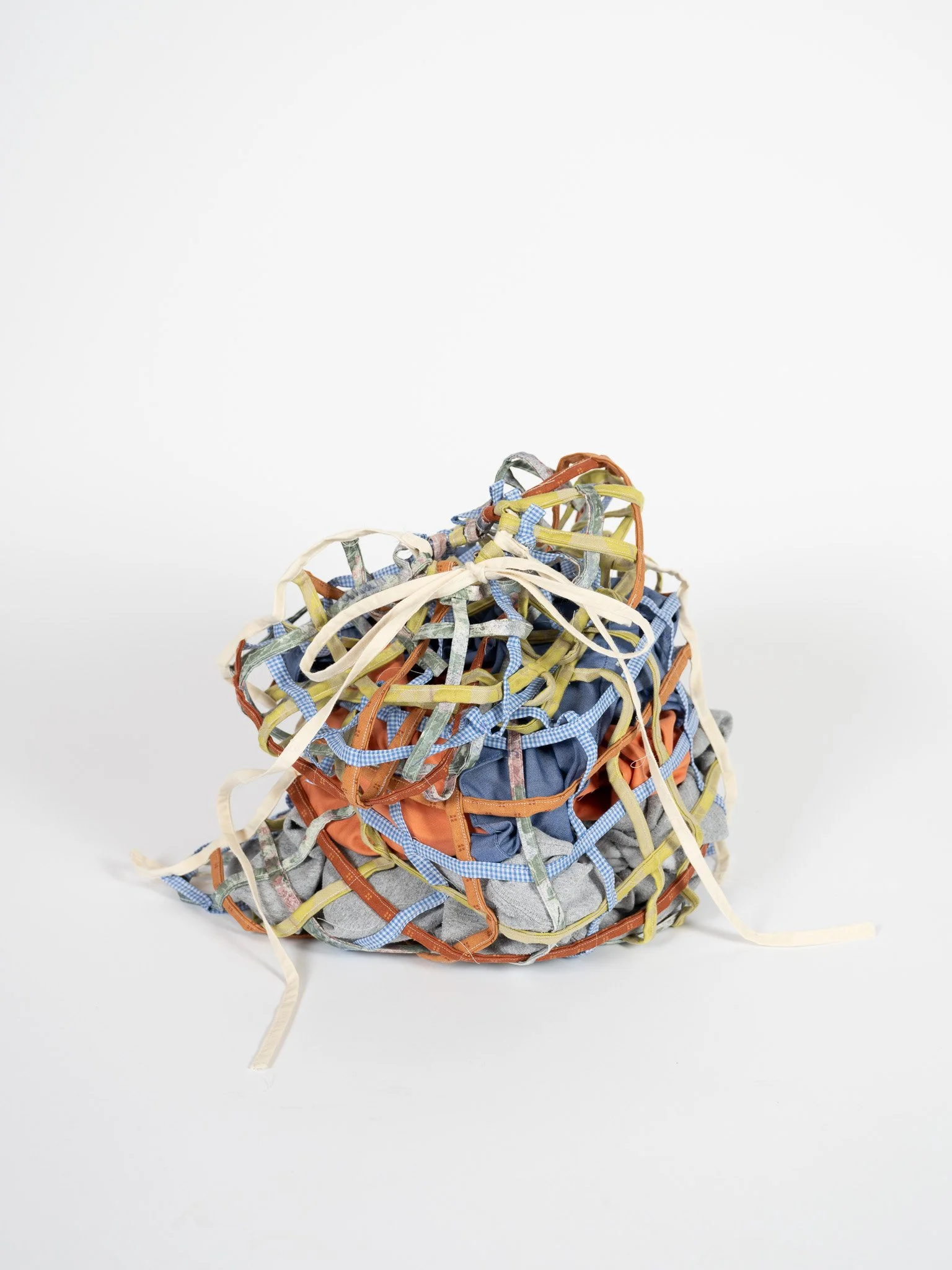 In these prototypes I explored different methods of weaving, knotting, and fastening to build up structure with the recycled fabric.