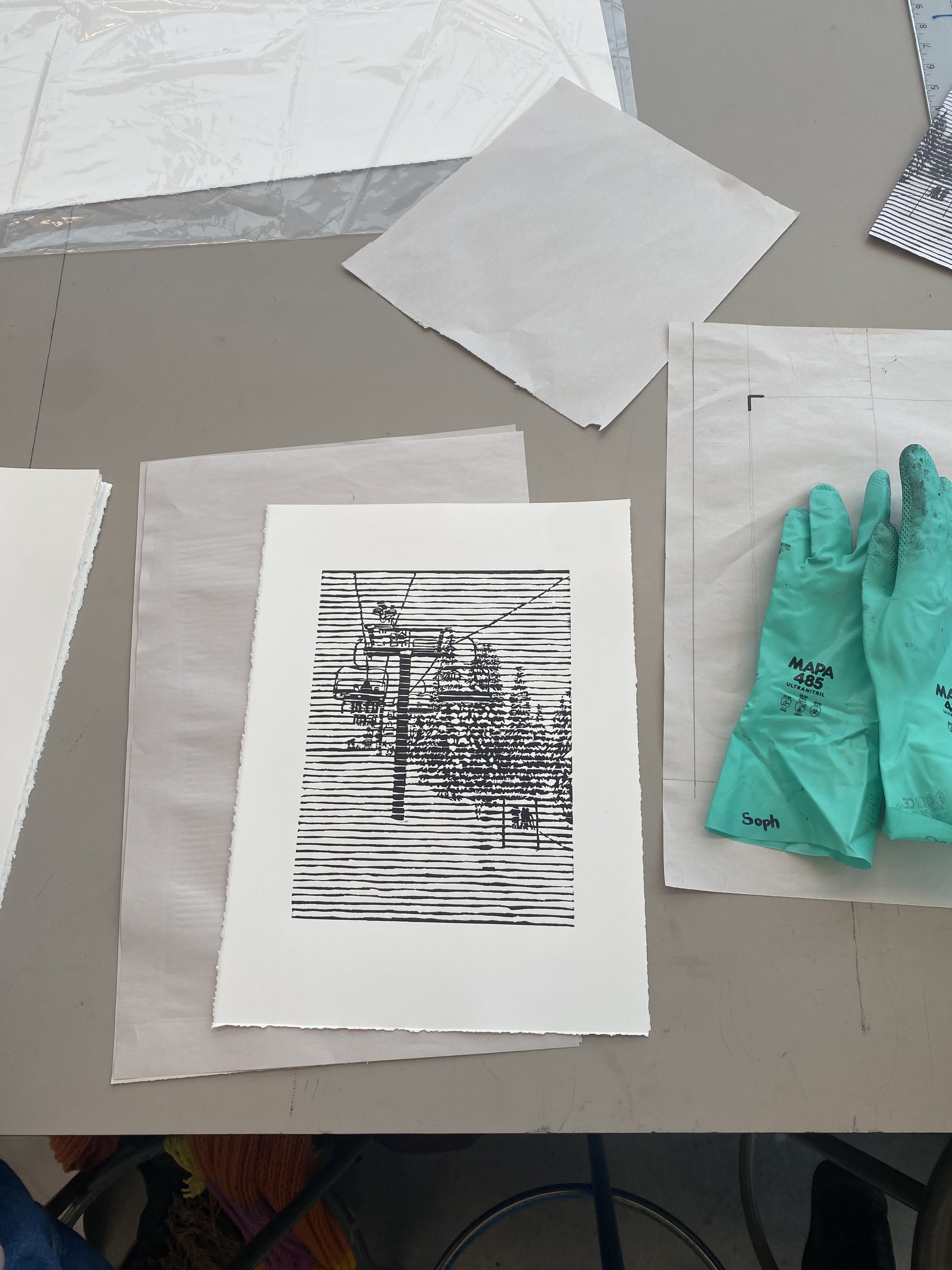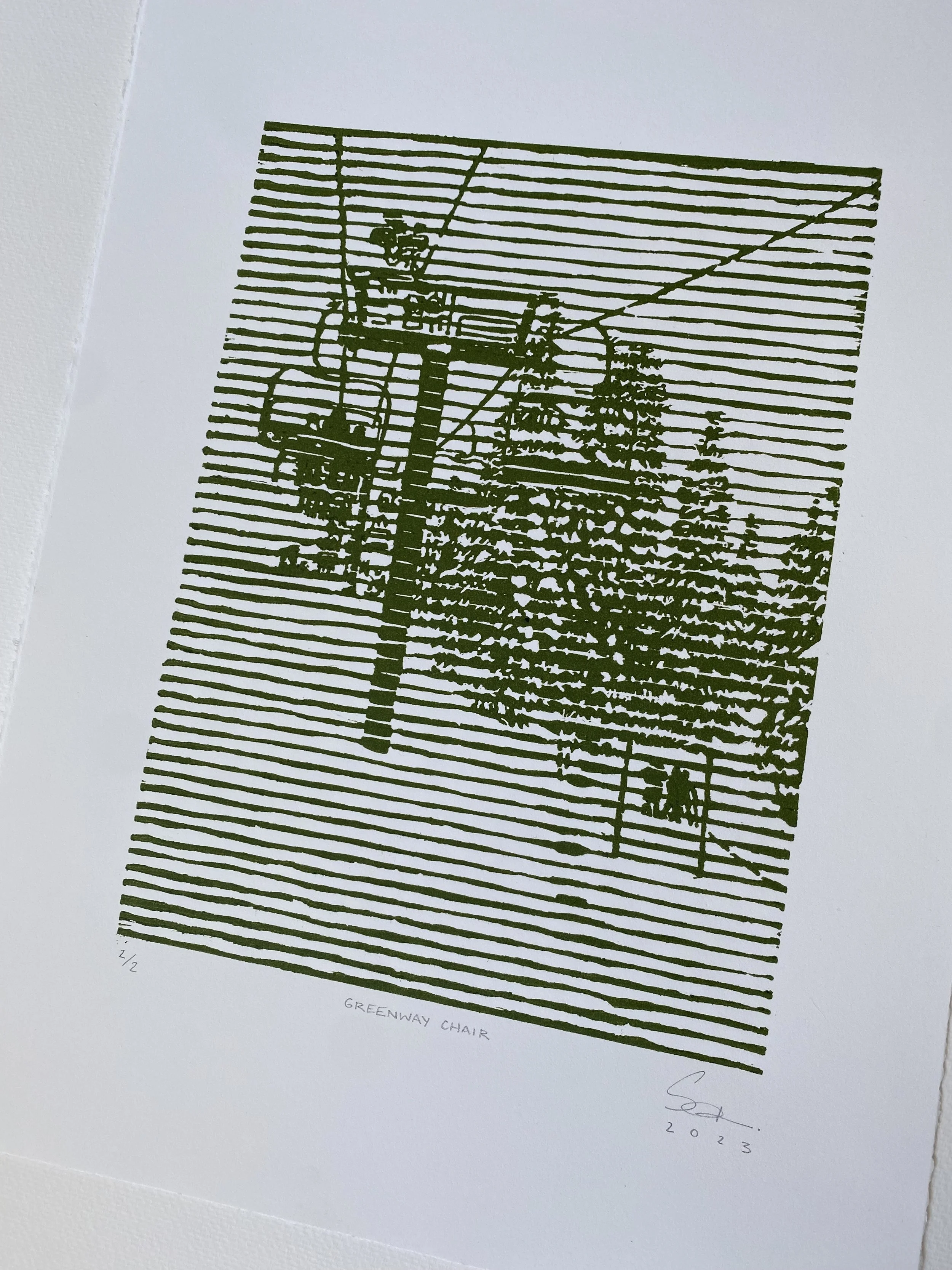 Greenway Chair Linocut Prints Linocut print series inspired by Grouse Mountain, BC. 11”x 15”Black Ink on 250 GSM White Stonehenge