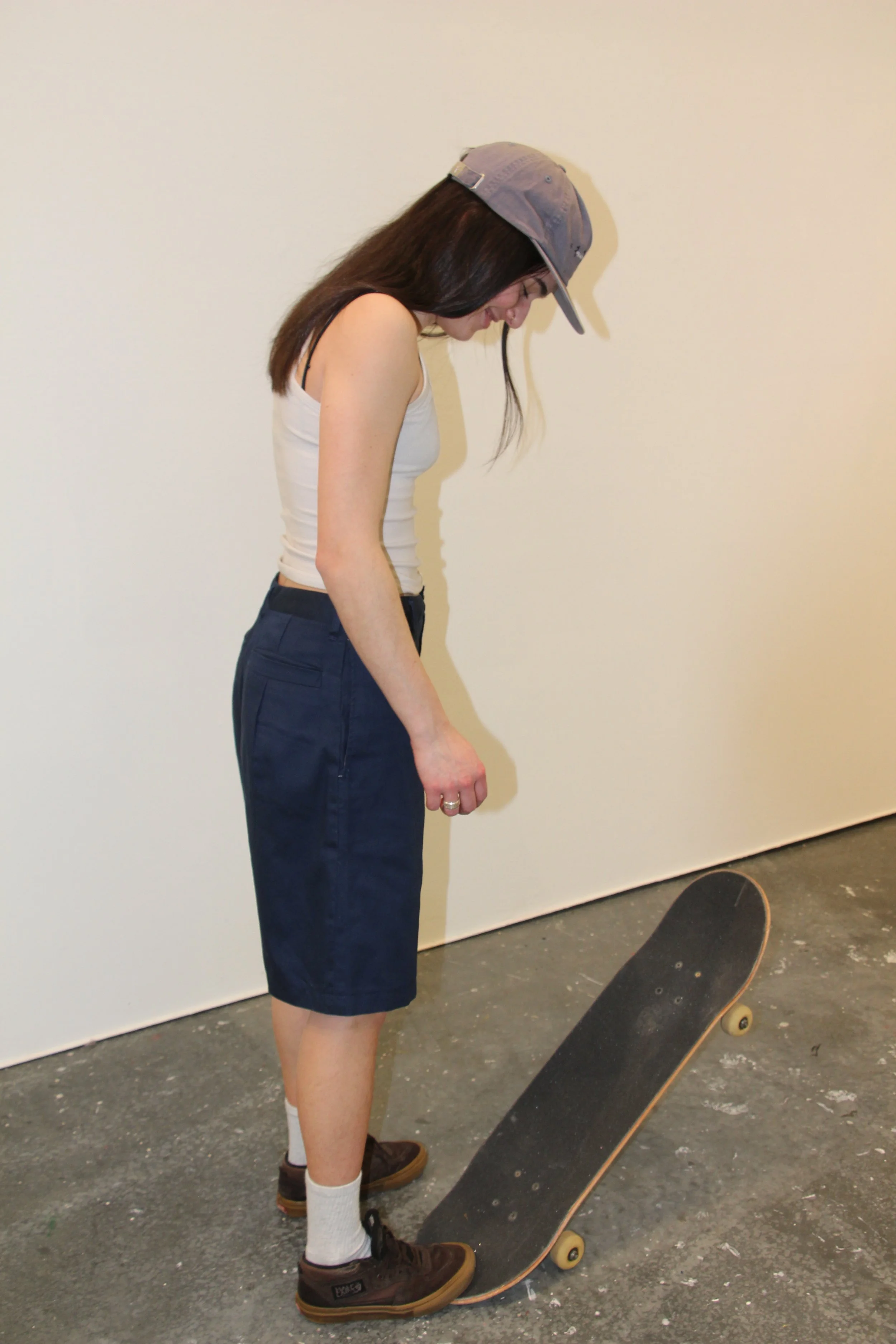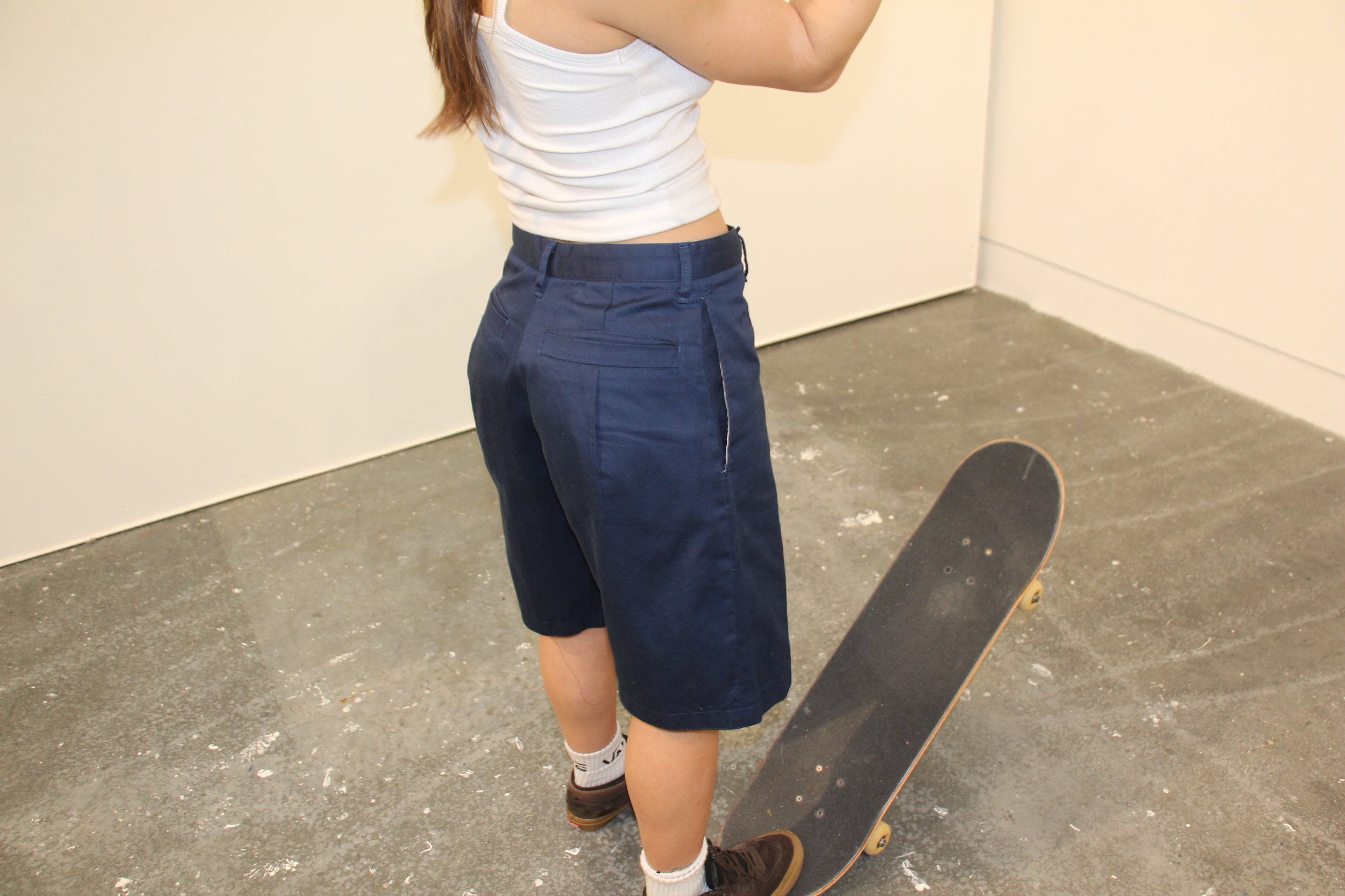 These shorts were made in response to the lack of skatewear in women’s sizes at local skate shops. I wanted to make baggy, comfortable, just over-the-knee shorts that give the skater room to breathe, while actually fitting her waist without a belt.