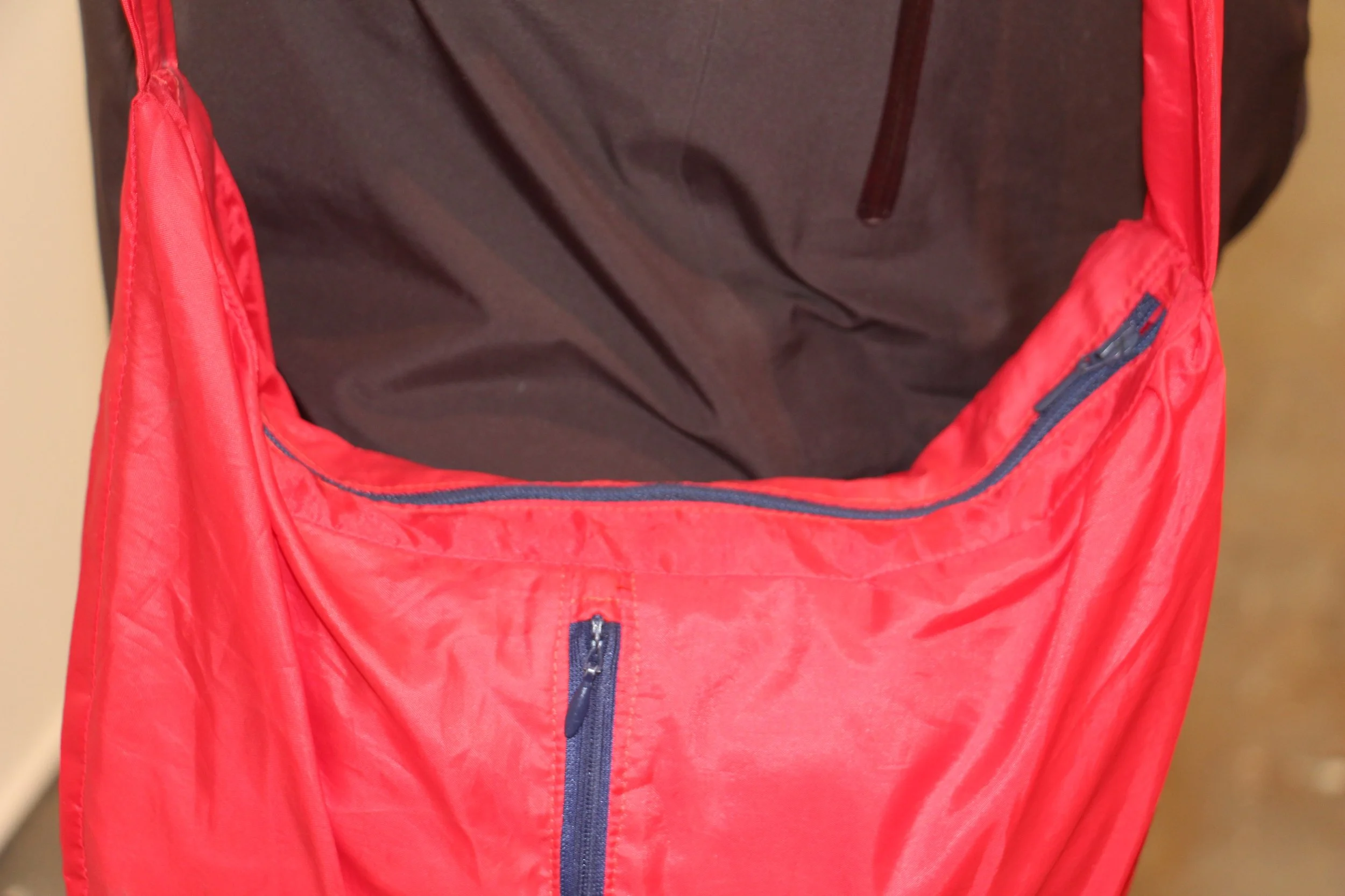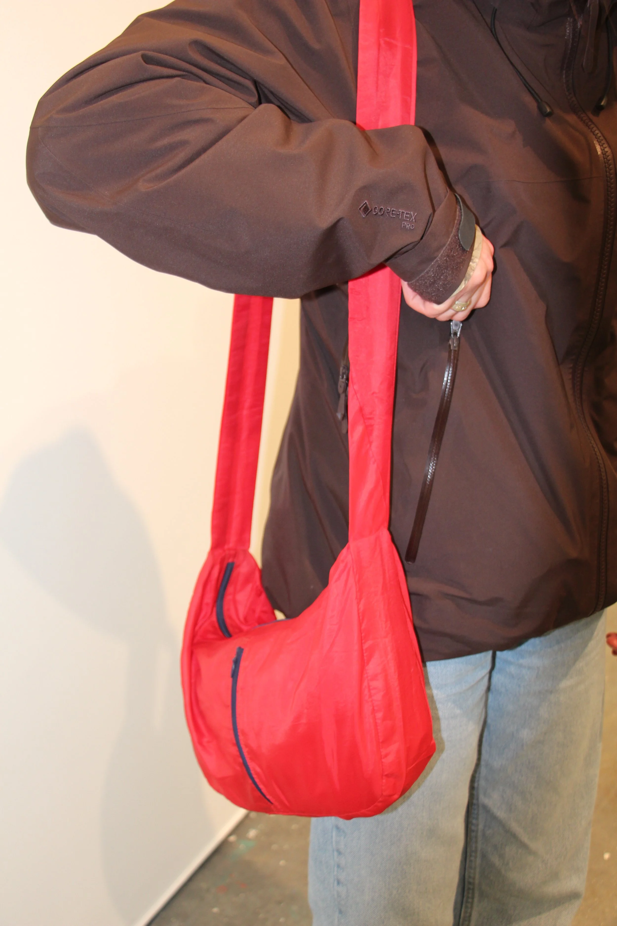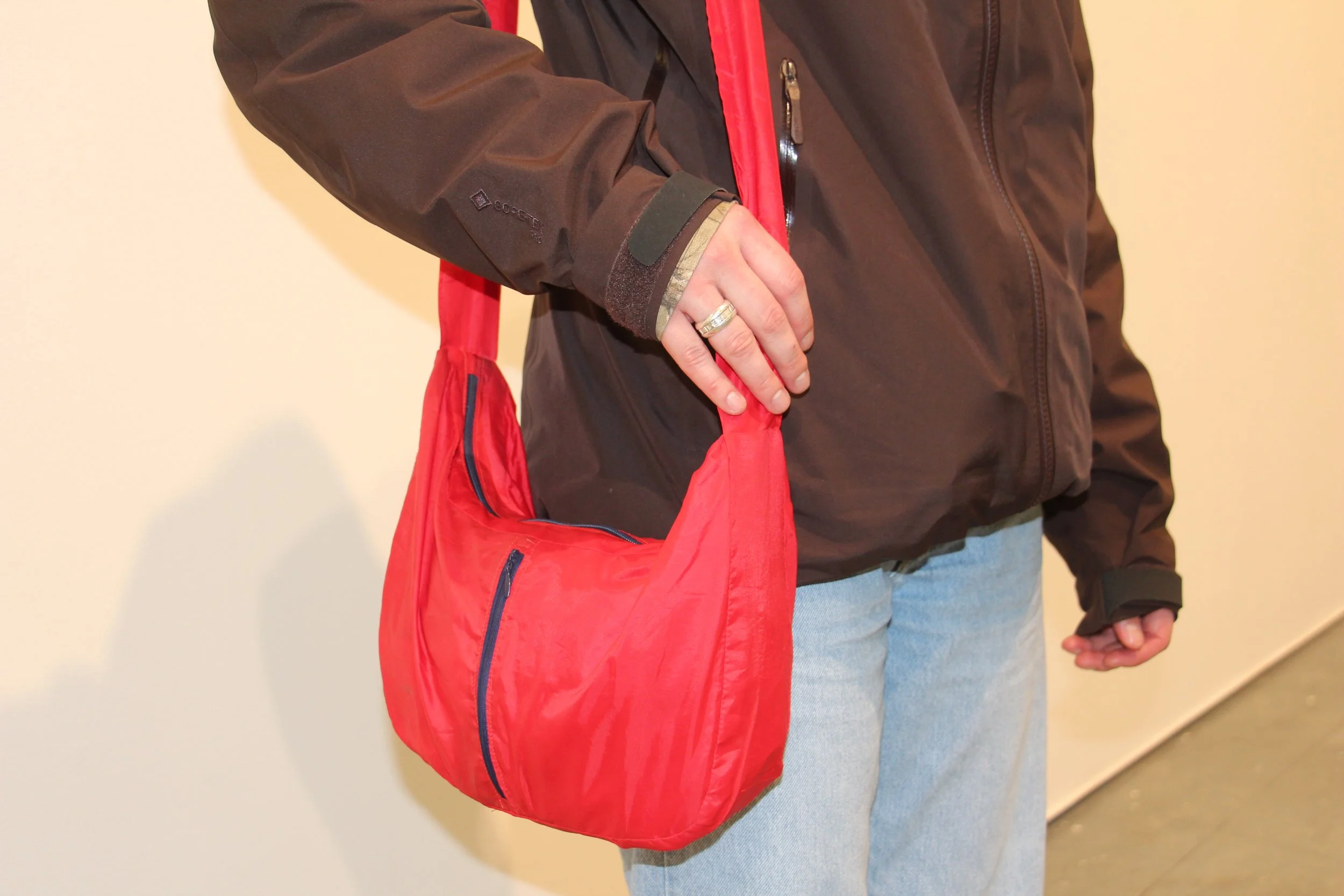 A bag made from a discarded umbrella, found in the streets of Rotterdam, NL. Lightweight and stuffable into any travel bag or pocket as an extra companion when you need it.
